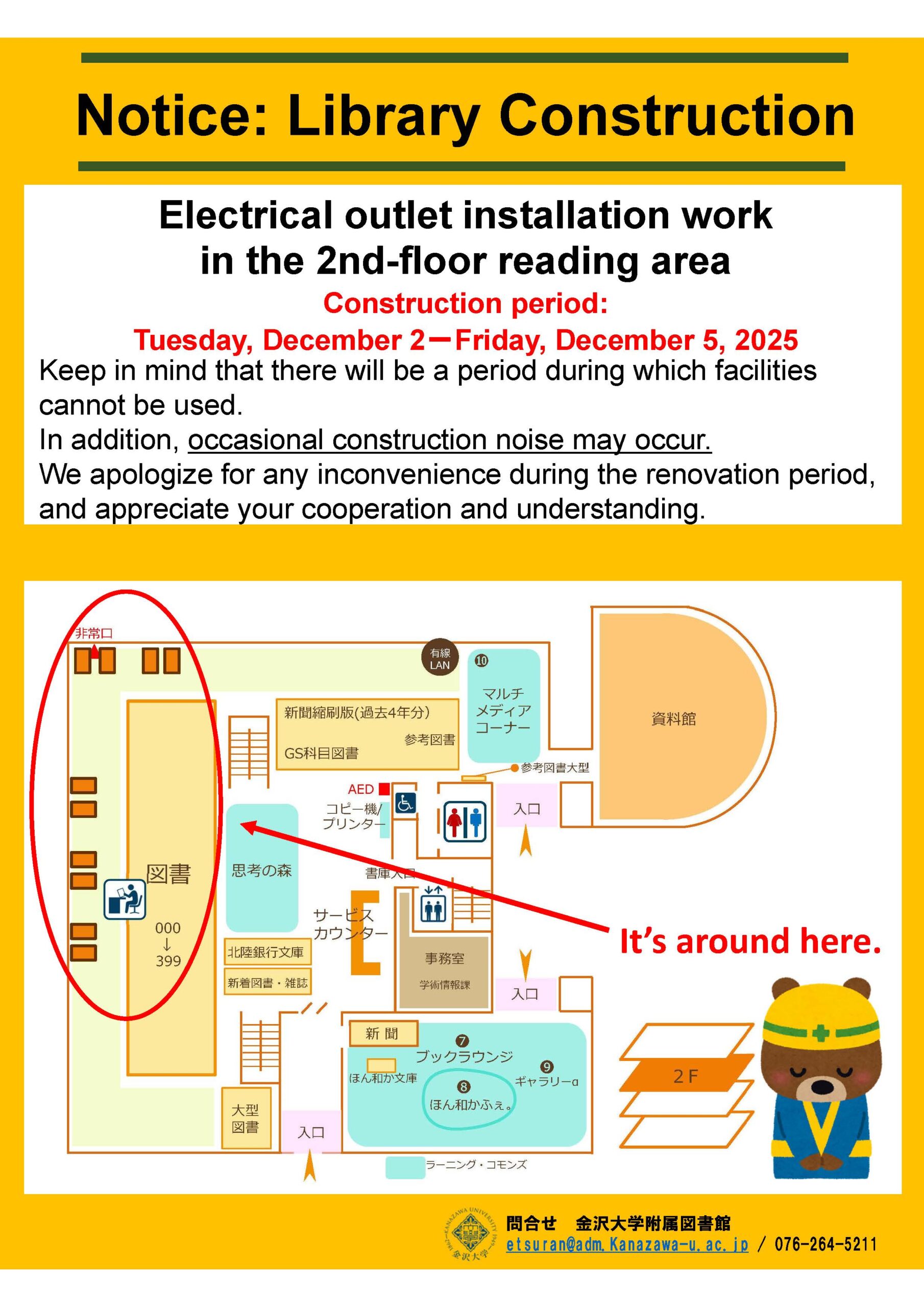 The Central Library will undergo electrical outlet installation work on the following dates.