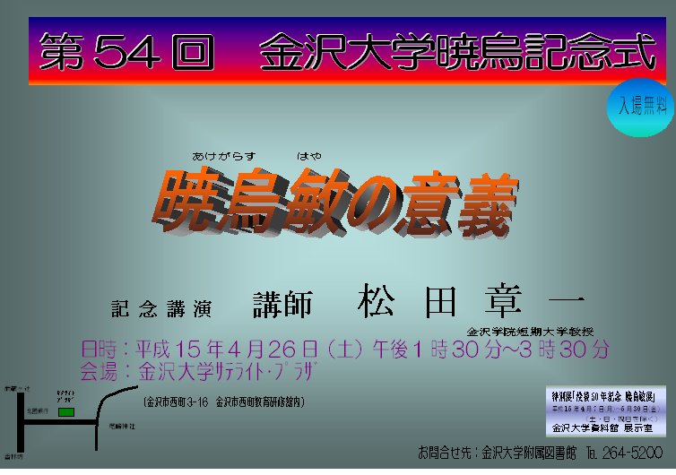 石川県松任市出身で、明治・大正・昭和の思想界・宗教界に大きな影響を与えた暁烏敏(あけがらす・はや)師が、個人蔵書としては類を見ない広範な学問分野の書籍約5万冊を、金沢大学に寄贈されたことを記念し、師の遺徳を偲ぶ行事として、毎年挙行されている。今年は53回目を迎えた。