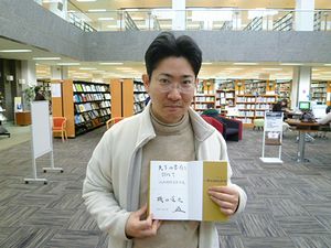 その来館記念に著書にサインをして頂きました。ご覧のように大変,立派なサインを頂きましたので,先生の許可を得たうえで,図書館カウンター前に展示させて頂くことにしました。