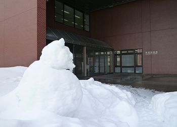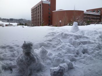 中央図書館前に雪だるまが出現 このところ,金沢市は大雪に見舞われています。そんな中,中央図書館の玄関前に学生さんが作った雪だるまが出現しました。耳がついています。もう一つあります。2つ並ぶと狛犬風?中央図書館のまわりは,このように雪に覆われています。ご来館の際は,足元にお気をつけてお越しください。