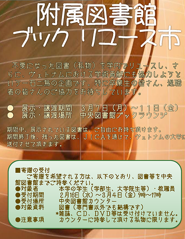 - 期間中,展示されている図書は,ご自由にお持ち頂けます。期間終了後,残った図書は,JICAを通じて,ヴェトナムの大学に送付させて頂きます。