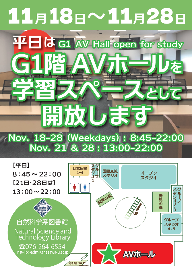 11/18-11/28(平日)AVホールを開放します / G1 AV Hall Open for Study (Nov. 18–28, Weekdays) 自然科学系図書館では、 以下の日程でG1階AVホールを自習室として開放します。 どうぞご利用ください。 日 程:11月18日(火)~28日(金)の平日 時 間:8時45分~22時 ※21日・28日は13:00 ~ 22:00 場 所:自然科学系図書館G1階AVホール 問合せ:自然科学系図書館 076-264-6554 / nst-lib@adm.kanazawa-u.ac.jp