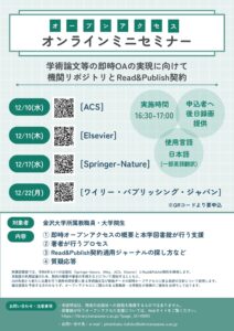 論文投稿を予定する方のみならず、オープンアクセスにご関心のある教職員・大学院生の皆様のご参加をお待ちしております。