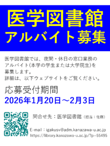 医学図書館窓口業務アルバイトの募集 1/20~2/3(金沢大学の学生対象)