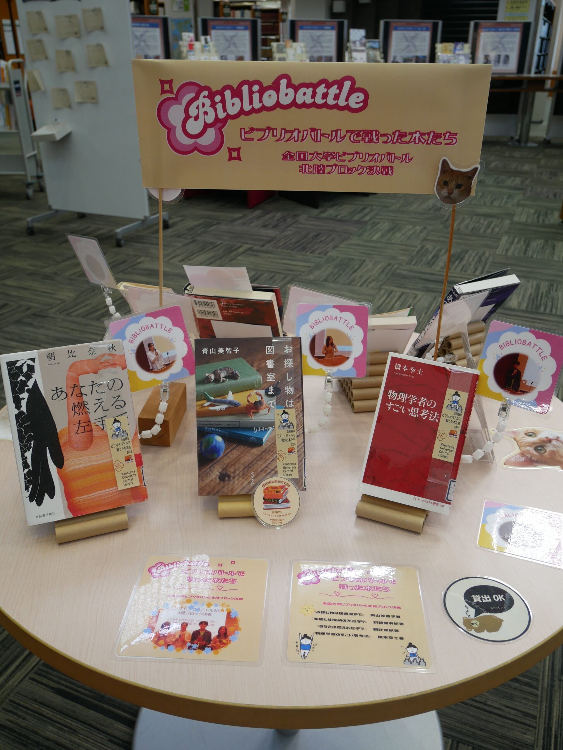 企画展示「ビブリオバトルで戦った本たち」 金沢大学附属図書館中央図書館では、ビブリオバトルで発表された図書の展示をしています。 ぜひご覧ください。 ■2025(2025年11月14日~)展示中! ■2024(2024年10月17日~2025年6月17日) ■2023(2023年11月14日~2024年3月29日) ■2022(2022年12月26日~2023年2月27日)全国ビブリオバトル2022準グランドチャンプ受賞記念展示 ■2021 ■2020 ■2019 ■2018 ■2017 ■2016 ■2015 ■2014